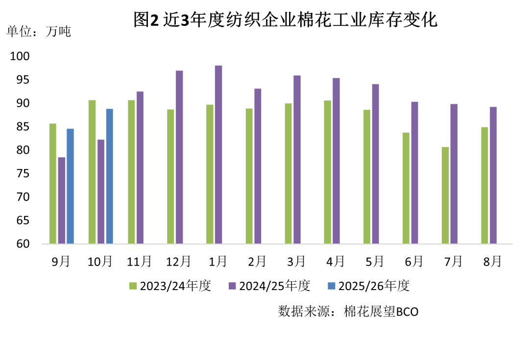 | 报告品种:棉花 原文链接:https://mp.weixin.qq.com/s/gbrk0QhHcu0rFBrr7rkXAQ 项目承担:北京棉花展望信息咨询有限公司 调查对象:新疆、山东、河北、河南、江苏、浙江、湖北、安徽、江西、山西、陕西、湖南等省、自治区的棉纺织企业 10月,国内棉纺织市场虽仍处传统旺季,但国内外需求改善不明显,订单增量有限且以小短单为主,纺织企业短期有补库需求,但后市信心不足,态度谨慎。据中国棉花预警系统对全国90余家定点纺织企业调查显示,本月行业产能利用率稳中略降,新棉上市带动原料采购增加,而纱线库存因销售不佳有所累积。11月新棉大规模上市,供应端压力持续加大;中美关税政策虽短期明确,但出口是否好转仍待观察。随着下游市场转入淡季,需求端走弱的风险依然较大。 一、产销形势环比走弱,成品库存增加 10月,纺织旺季进入后半程,市场局部好转但幅度有限。纱价下行推升企业经营压力,部分内地纱厂观望情绪较浓,产销依旧偏弱,成品库存略有上升。下旬受中美经贸磋商预期改善、国内降温以及“双十一”临近带动,下游补库略有好转,部分产品走货较好,但下游询价多而采购谨慎。 10月,纯棉纱产量环比下降1.6%,同比增长2.3%。调查样本中纯棉纱占比为49.8%,环比下降0.3个百分点;混纺纱和化纤纱占比为50.2%,环比增加0.3个百分点。纯棉布产量环比下降2.1%,同比增长1.8%,其中纯棉布占比环比下降0.7个百分点。纱线销售率为74%,环比下降1个百分点。截至10月底纺织企业纱线库存26.1天,环比增加1.3天。坯布库存32天,环比增加0.9天。 二、棉纱价格存下行压力,企业盈利依旧承压 新棉增产背景下,棉纱持续面临降价压力。月末订单呈现走淡迹象,部分企业为促成交选择让价销售,国内外棉纱价格均出现下调。国产32支纯棉纱10月均价为20469元/吨,环比下跌241元/吨,跌幅1.2%,同比下跌1272元/吨,跌幅5.9%;进口32支纯棉纱月均价为21130元/吨,环比下跌115元/吨,跌幅0.5%,同比下跌1264元/吨,跌幅5.6%。受中美经贸会谈进展等因素提振,本月棉花价格有所反弹,纺纱企业利润受到挤压,经营压力持续加大。