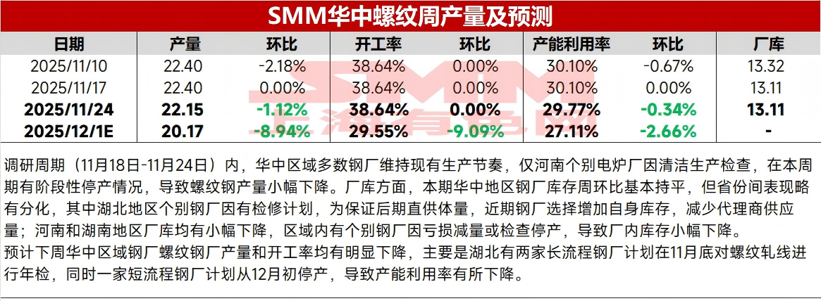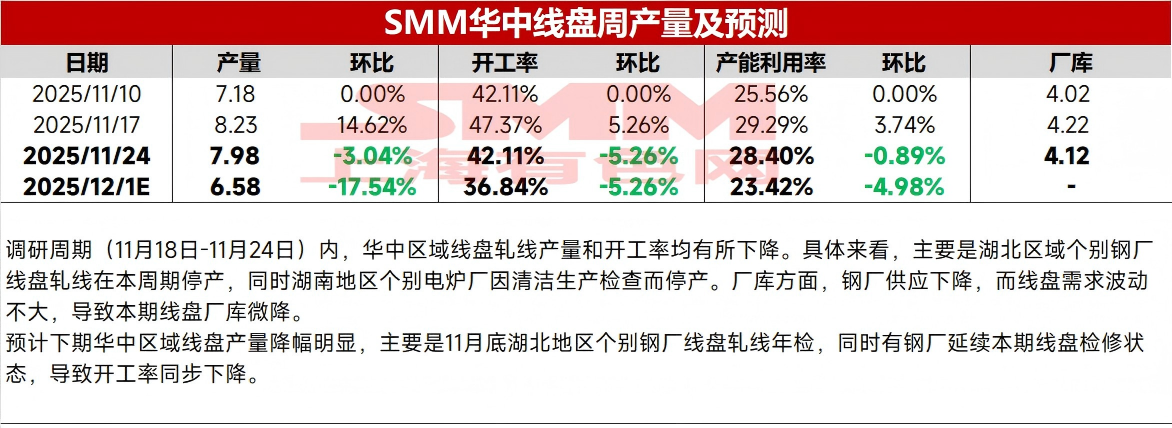 | 报告品种:螺纹钢 原文链接:https://mp.weixin.qq.com/s/pRhZrDVB6zGeYe0OR9S10g 调研周期(11月18日-11月24日)内,华中区域螺纹钢产量小幅下降;线盘产量和轧线开工率均有所下降。