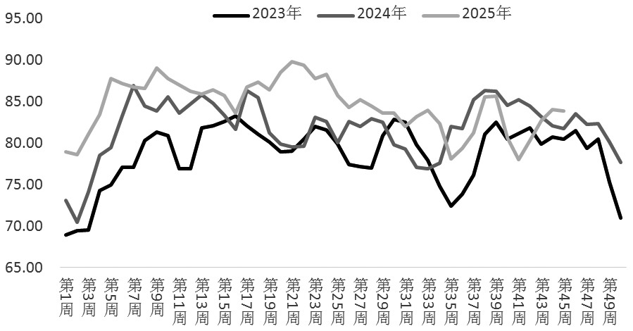 图为尿素开工负荷(单位:%) 开工负荷维持高位 截至目前,国内尿素开工负荷为83.91%,较去年同期上升2.18个百分点。其中,煤制尿素开工负荷为87.23%,较去年同期上升0.58个百分点;气制尿素的开工负荷为72.55%,较去年同期下降6.28个百分点;中小颗粒尿素开工负荷为84.18%,较去年同期上升3.07个百分点;大颗粒尿素开工负荷为82.83%,较去年同期下降1.65个百分点。目前,国内尿素的周产量在142.04万吨,仍然处于供大于求的态势之中。
