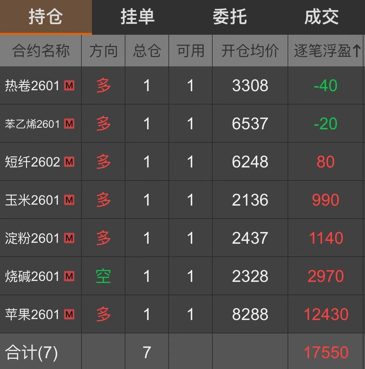 | 一、开仓总结 苹果:2025年9月22日,达到启动点的开仓条件,所以在14:54开多一手苹果2601合约,开仓价为8288。 淀粉:2025年10月31日,达到启动点的开仓条件,所以在14:49开多一手淀粉2601合约,开仓价为2437。 玉米:2025年11月4日,达到启动点的开仓条件,所以在14:51开多一手玉米2601合约,开仓价为2136。 烧碱:2025年11月14日,达到启动点的开仓条件,所以在14:51开空一手烧碱2601合约,开仓价为2328。 短纤:2025年11月25日,达到启动点的开仓条件,所以在14:54开多一手短纤2602合约,开仓价为6248。 热卷:2025年11月25日,达到启动点的开仓条件,所以在14:56开多一手热卷2601合约,开仓价为3308。 苯乙烯:2025年11月26日,达到启动点的开仓条件,所以在14:57开多一手苯乙烯2601合约,开仓价为6537。