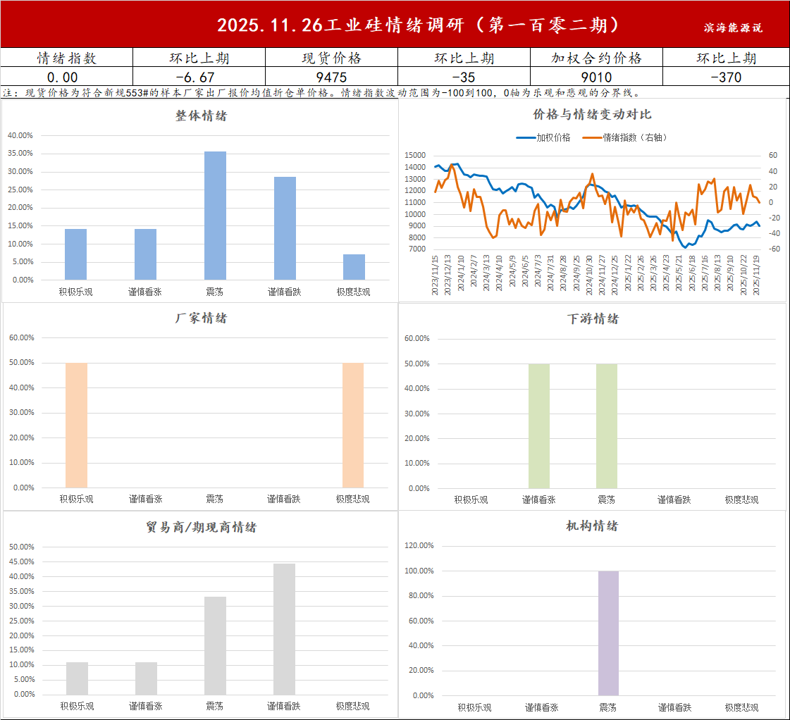 | 报告品种:工业硅 原文链接:https://mp.weixin.qq.com/s/aTwXMDrF31ydBcJIoOP5VQ 根据样本统计,本期情绪指数为0,较上期回落6.67,样本参与者情绪有降温,整体趋向中性,近期期现价格有松动回落,现货波动较小,盘面重心下移,从基本面变化来看,相较前期也转向宽松。
