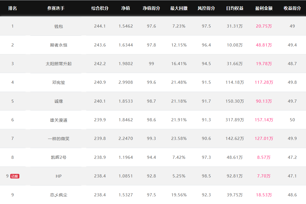 奖金上不封顶 特定期货公司参赛奖金翻倍 优秀选投 每周选优秀选手对接资金 达标必投 单笔最多给1个亿管理型资金 管理型资金盈利分成20%~70% 免费培训/研报/调研/咨询 诚邀您参赛! 为了促进国内期货市场交易人才的发展和成熟,七禾网举办本次“期货CTA英雄联盟”实盘大赛&超级服务,招募优秀的操盘手,为优秀的交易人才搭建桥梁! 第四届大赛圆满结束,第五届荣耀开启,欢迎参赛!第五届大赛已于2025年7月1日开赛,火热报名中,比赛过程中持续接受报名,大赛奖金&管理型资金&超级服务,等你来领! 2023年2月16日后,在主办方指定的几家期货公司中的某一家C公司新开户参赛,享奖金翻倍! 在主办方指定的几家期货公司中的某一家B公司新开户参赛,享奖金翻倍! 大赛中的优秀选手,只要在大赛中有3个月及以上的实盘业绩,主办方将每周发送优秀参赛者的业绩、资料给合作的数十家资方,供其考察是否投管理型资金。至2022年8月12日,资方已选出23名优秀投顾,累计投入超5.5亿元管理型资金。 优秀选投:通过主办方及资方考核后,将获得管理型资金(资金来源:七禾网自有资金(买优秀选手的基金产品)、七禾网股东、数十家合作资方) 在主办方指定的几家期货公司中的某一家B公司新开户参赛,以及2023年2月16日后,在主办方指定的几家期货公司中的某一家C公司新开户参赛,可以按照:“达标必投”进行考核(将给予单笔100万元~1亿元的管理型资金,分红比例20%~70%),详细规则请联系微信:15858201632 大赛综合排名前10名 2025.11.27
