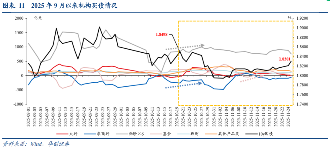 今年来看,机构跨年配置意愿仍存,但交易驱动带来的收益率下行幅度或较为有限。今年而言,年末流动性环境整体平稳但降息预期偏谨慎,收益率下行缺乏政策催化。同时短期市场对央行买债规模预期不足、基金销售费率新规扰动及地产相关消息的边际变化,以及低利率环境下收益率下行赔率预期不高等,农商行、基金等交易型资金未迎来显著利好因素,尚未出现年末抢跑行情。而对保险等配置资金而言,前期宽信用及供给冲击已过,风险偏好和费率新规的负面扰动或难超前期,预计收益率进一步上行超过前高的风险可控,当前点位已具备一定性价比,保险驱动的年末配置行情仍可期待。不过,考虑到市场对于明年债市行情预期偏谨慎,基于资本利得博弈的抢跑行情幅度或有限,因而收益率整体下行幅度需理性看待。