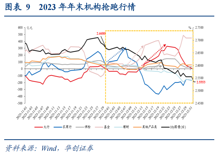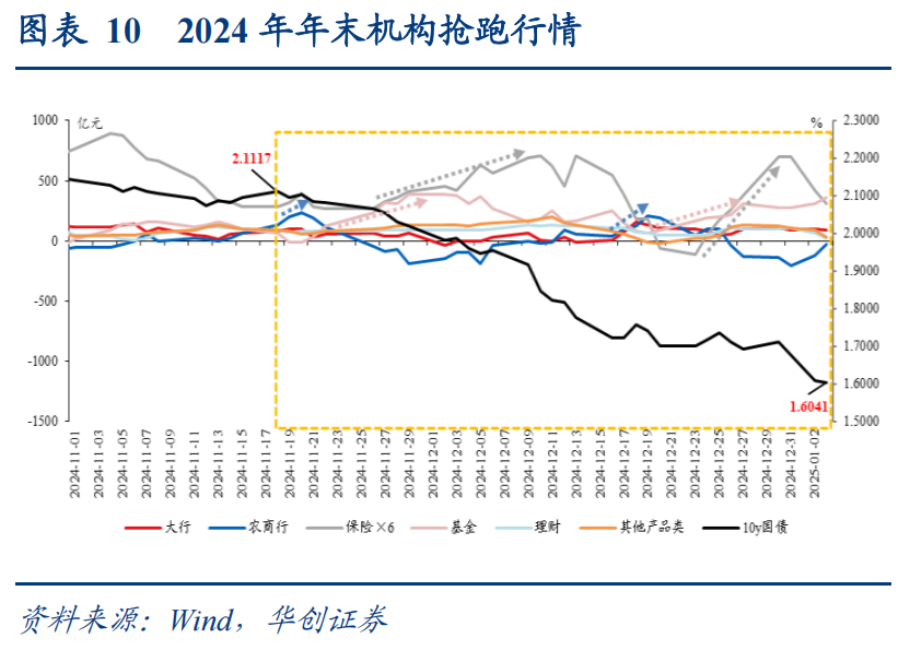 2、机构行为:包括交易型和配置型两类资金 交易和配置两类资金进场共同推动了债市年末行情的演绎。往年债市完成“最后一跌”后,部分机构会逐步进场布局年末行情。但由于各类机构的出发点略有不同,农商行、基金更多是基于对收益率下行的抢跑交易,需要有利好驱动;保险则更多是基于未来年储备资产的配置诉求,进场时点略有靠后,或在收益率调整阶段逐步配置。回顾2023-2024年年末机构抢跑行情,存在农商行、基金、保险先后进场抢跑,且在“学习效应”下进场时点不断前移的特征。