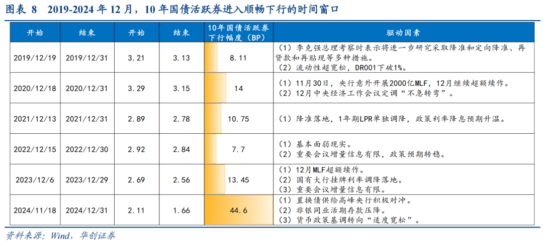 从历年影响12月收益率下行的驱动因素来看,主要驱动因素集中于货币条件和年末机构配置/交易行为。 1、货币条件:关注重要会议表态和年末资金环境 货币条件占优是近年来驱动12月收益率下行的主要因素,包括央行释放的政策预期以及资金环境两方面。政策预期方面,12月是政治局会议和中央经济工作会议的政策窗口。由于临近年末宽信用效果短期难以验证,市场通常对宽货币先进行交易,例如2019年高层再提降准,2020年中央经济会议定调“不急转弯”、2021年降准、LPR不对称调降、2023年存款挂牌利率调降、2024年政治局会议通稿中货币政策基调转向“适度宽松”等。资金条件方面,2019年、2023年12月央行积极投放MLF,2020年11月末意外操作MLF对冲永煤流动性危机,均为年末债市走强提供较为宽松的资金环境。