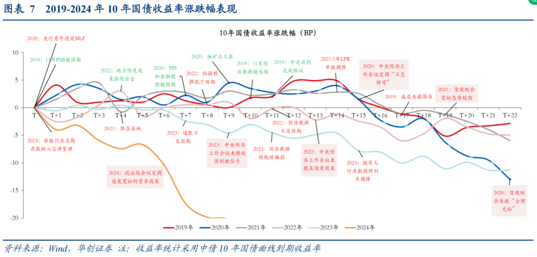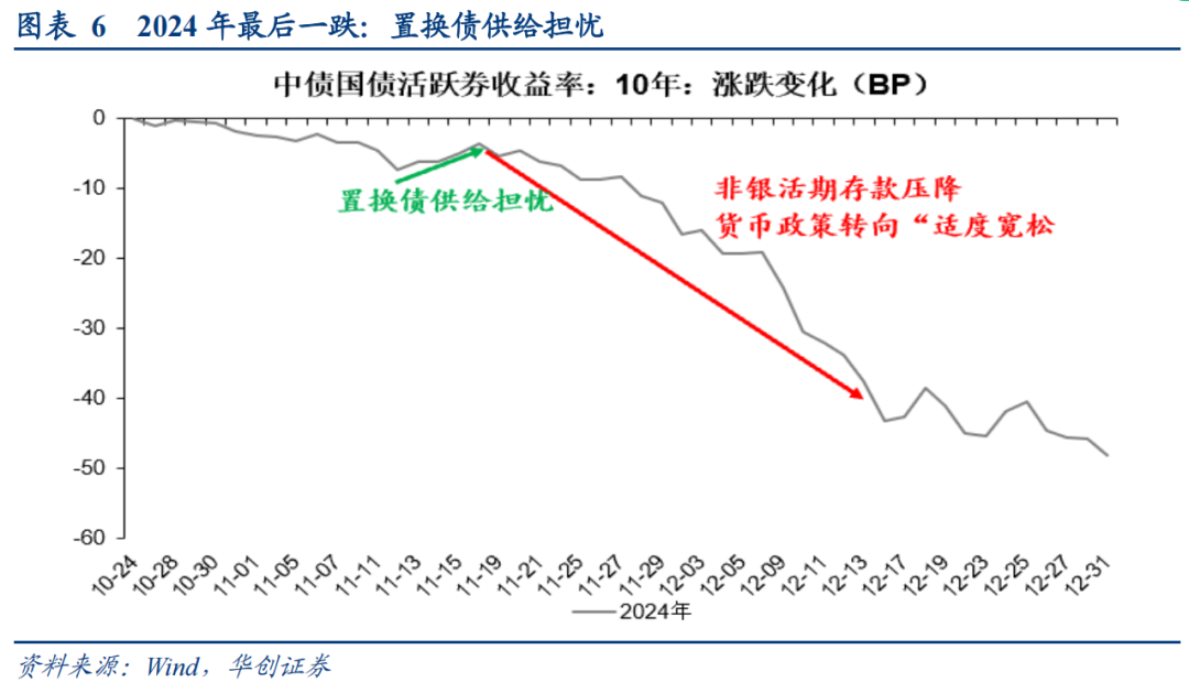(5)2024年11月:置换债供给放量短暂扰动债市。11月8日财政部官宣超10万亿的化债政策组合拳,置换债供给担忧下收益率短暂上行。但随后11月中下旬开始,置换债供给高峰扰动有限,非银同业活期存款压降,货币政策表态“适度宽松”打开降准降息想象空间叠加年末抢跑行情启动,债市出现极强的学习效应,收益率快速下行突破。
