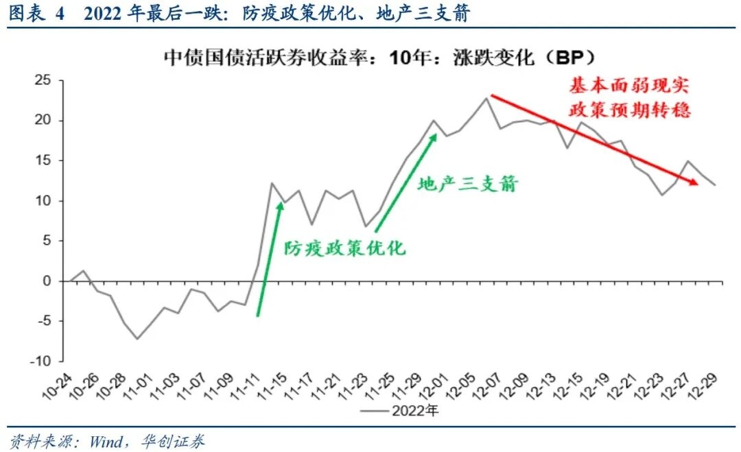 (3)2022年11月:政策重大调整使债市预期转向,赎回潮负反馈下收益率快速上行。11月至12月上旬,资金价格中枢持续上行,防疫政策优化,地产救助“三箭齐发”,稳地产“16条”落地,债市预期转向,提前定价经济修复“强预期”,短债基金和理财产品的破净赎回潮使得负反馈不断加强,收益率出现大幅快速调整,10年期国债收益率大幅上行至年内高点。至12月中下旬,基本面“弱现实”短期并未显著改善,预期充分定价和理财赎回压力企稳后,10年期国债收益率震荡修复。