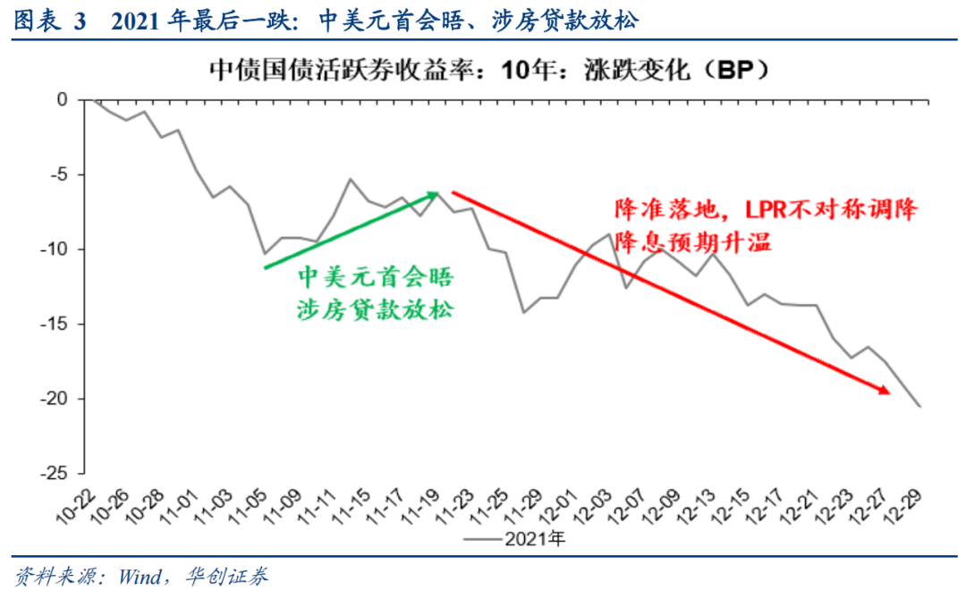 (2)2021年11月:货币政策维稳态度明确,期间受中美元首会晤以及涉房贷款放松消息影响,债市面临扰动。11月上旬地产放松预期发酵,现券收益率回到2.9%以上;中旬经济数据发布不改中长期下行压力预期,关键点位附近市场缺乏交易主线,债市情绪受中美元首会晤、地产贷款放松等消息面频繁扰动;下旬央行货政报告不提“总闸门”,跨月时点操作继续加码,宽松预期再起,现券收益率小幅下行至2.9%以下。12月上旬二次降准落地,LPR不对称降息,市场对政策利率降息预期升温,年末抢跑启动。