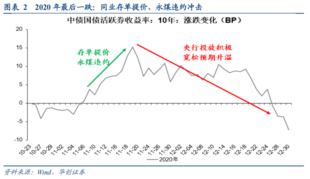 以10年国债活跃券收益率走势为基准,复盘2020年以来债市“最后一跌”的表现: (1)2020年11月:受同业存单继续提价,永煤违约事件冲击影响,收益率快速上行。11月上旬,央行记者会提及“钱生钱”问题,强调金融服务实体经济,叠加美国大选初步结果提振海外风险偏好,现券收益率重新回到3.2%以上。中旬,永煤违约事件开始发酵,信用债抵押品融资受限,流动性分层加剧,叠加税期临近,资金面显著收敛,现券收益率继续上行。月末金融委会议明确打击“逃废债”后,债市超跌回调转向震荡。12月在央行持续投放跨年流动性、宽松预期升温以及配置盘力量驱动下,抢跑行情启动。