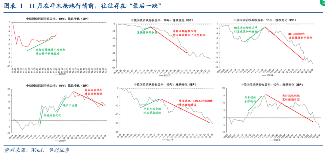 | 年末债市“最后一跌”,往年表现如何? 11月以来,权益市场经历前期高位震荡后有所回调,而债市则受短期降息预期不足、基金新规扰动也呈现出“涨不动”的状态。从季节性来看,11月中下旬债市往往存在年内“最后一跌”的特点,随后开始演绎年末抢跑行情。