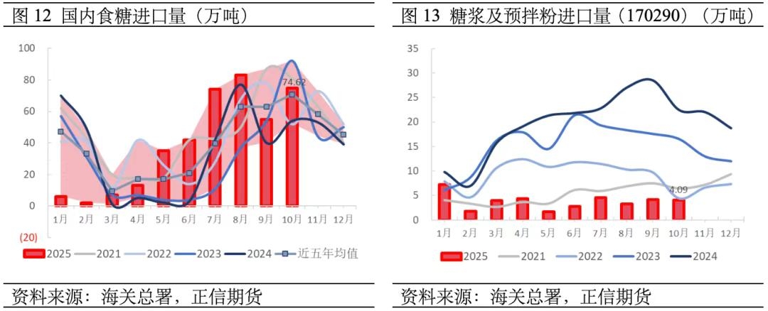 四、国内进口:食糖进口量历史高分位,进口糖主导国内供应 今年7-10月国内食糖进口量处于近五年历史高位,且明显高于近五年均值。从累计同比变化看,2025年截至10月国内共进口食糖390.54万吨,同比增长13.8%。自去年12月泰国糖进口管制以来,今年截至10月糖浆和白砂糖预拌粉(税则号170290、2106906项下)进口量为100万吨,同比明显减少。从月度进口量看,7月进口74万吨,同比增76.19%;8月进口83万吨,同比增7.79%;9月进口55万吨,同比增37.5%;10月进口74.62万吨,同比增38.19%。进口量增加的原因之一是国际供应尤其是巴西榨季供应充足,出口量大,且糖价低迷,国内进口加工糖成本较低,利润提高,一定程度上挤压了库存陈糖的销售空间,国内糖现货市场由国际供应主导。