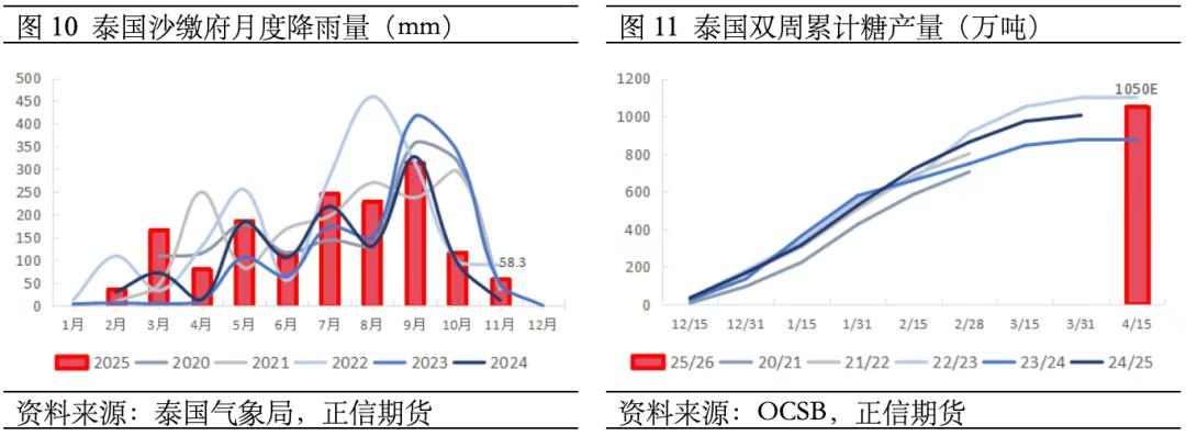 泰国产区降雨情况同比改善叠加种植面积扩大,可供出口量有望增加。以东北部主产区沙缴府为例,今年截至10月以来平均降水量同比明显增加,已接近2022年甘蔗高产时水平。据OCSB预测,2025年泰国甘蔗种植面积由上年的970万莱(155万公顷)扩大到1050万莱(168万公顷),增幅8%;2025/26榨季糖产量预计将增长5%,达到1050万吨。