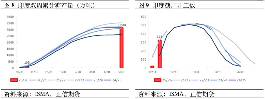 三、国际供应:北半球主产区丰产预期强烈,新榨季可供出口量预计增加 多方机构预测印度新榨季产糖表现将同比大幅增长,丰产预期最为强烈。苏克敦(Sucden)预测印度25/26榨季除糖转乙醇后将产糖3260万吨,同比增25%;印度制糖与生物能源制造商协会(ISMA)预测值为3095万吨,同比增18.6%;印度全国合作糖厂联合会(NFCSF)预测值为3150万吨,同比增20.7%。 印度压榨进度同比加快,新榨季出口量将增加。截至11月15日,印度已有325家糖厂开榨,占总量半数以上,去年同期为144家,本榨季压榨进度相对提前。据NFCSF统计预测显示,印度主要产糖区估产分别为:马哈拉施特拉邦1250万吨、北方邦1100万吨、卡纳塔克邦700万吨。其中350万吨食糖将转用于生产乙醇,国内消费为2900万吨,期初库存为500万吨,则将出现200-250万吨的盈余,目前政府已批准其中150万吨用于出口。