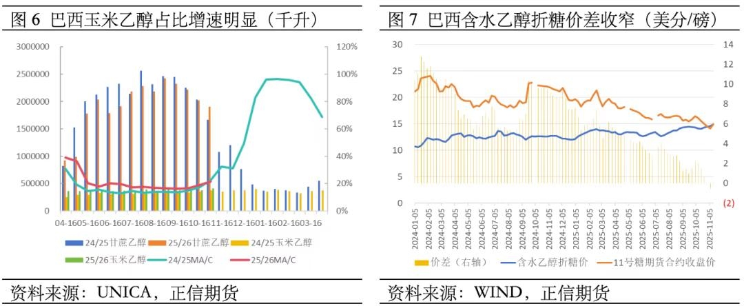 此外,玉米乙醇的低成本优势也发挥驱动制糖比高企的作用。据巴西综合制糖和制醇企业São Martinho季报所测算的数据,当前榨季生产玉米乙醇比生产甘蔗乙醇成本低约23%,主要因为玉米制醇的副产物可用作动物饲料,这进一步摊薄了玉米乙醇的实际成本。从产量上看,玉米乙醇产量有更强的上涨趋势,其产量占巴西乙醇总产量的比例也在逐年提高。所以尽管近两年糖价下跌较多,糖醇价差一度收窄,甚至在近期反转,巴西的综合糖厂还是不愿意更多地生产甘蔗乙醇,这也是制糖比维持高位的原因之一。