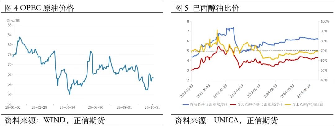 原油价格下跌是驱动因素之一。从OPEC一揽子原油价格走势来看,自今年6月份以来,国际油价已下滑近20%,因而近期巴西国家石油公司调低国内A类汽油价格,致使醇油比价向70%收敛,乙醇经济性降低,从而糖厂可能后续仍维持高制糖比,产量供应预期进一步增强,对糖价施压明显。