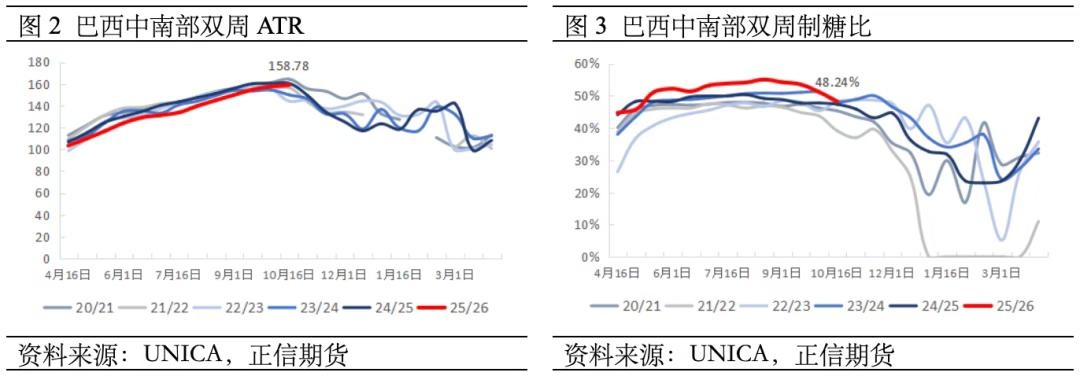 二、国际供应:巴西产量追赶预期,制糖比维持高位 平均出糖率近五季低位,巴西糖厂提高制糖比。巴西25/26榨季初,因主产区连续强降雨影响,甘蔗出糖量显著降低,吨甘蔗含糖量(ATR)从上季平均122.26kg/吨降至116.64kg/吨,降幅5%;产糖量因此减少,截至7月1日,巴西中南部累计产糖1225万吨(-203万吨),同比减少14.2%。为追赶榨季产糖预期,巴西糖厂调高了制糖比,从上季平均48.5%提高至51.7%,8月上半月制糖比峰值达55%,截至10月16日,巴西中南部累计产糖3602万吨(+32万吨),已赶超上榨季。