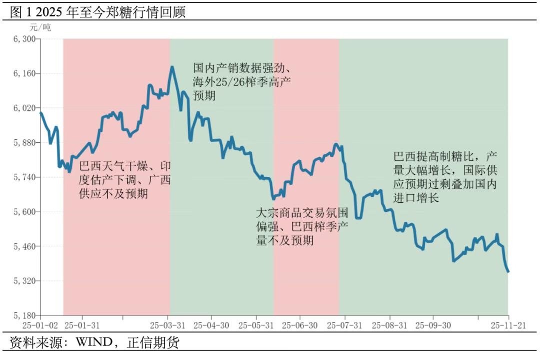 | 9月以来,白糖价格不断下跌,多次下破前低支撑,主要由国际供应预期过剩叠加国内进口增长驱动。一方面,巴西糖厂调高制糖比追赶产量预期,产量同比增加,印度与泰国新榨季预期丰产,可供出口量增加,国际供应过剩预期高涨;另一方面,国内受国际糖价格影响,配额外进口利润打开,进口量同比大幅增长。整体来看,白糖基本面偏弱,价格明显承压。 一、行情回溯:甘蔗提产周期,期价震荡下行 甘蔗因其具有宿根特征,生长表现出周期性。通常表现为2-3年增产、2-3减产,因而价格也存在相似的周期性特点,25/26榨季属于全球甘蔗增产期。此外主产区甘蔗耕地扩张趋势明显,也进一步提高了糖料供应。 今年以来,白糖期货整体呈震荡下跌趋势,主要包括四个阶段,年初至4月初是国内供应不及预期主导的上涨阶段;4-6月是国际供应宽松和国内进口增量预期主导的下跌阶段;6-7月底是反内卷背景下大宗交易氛围偏强主导的上涨阶段;8月至今是巴西供应超预期和国内进口增长主导下跌阶段。