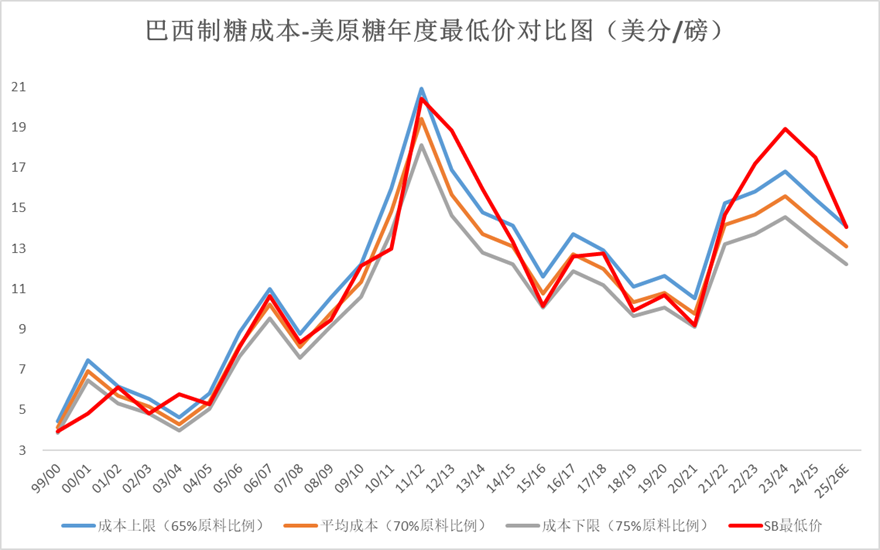数据来源:Consecana Cepea Wind 大地期货研究院 巴西制糖成本主要由甘蔗原料成本、能源以及化学辅料成本和人力成本等要素构成,其中甘蔗原料占巴西制糖成本的比重一般在65%-75%区间。 根据甘蔗收购价倒推出巴西的制糖成本区间,和美原糖期货年内最低点比较后可看出,巴西制糖成本对盘面底部具有动态支撑性。 由于巴西独特的甘蔗定价体系,巴西糖价和乙醇价格本身就会决定制糖成本的高低。其中现货糖价和美盘相关性较强,会形成价格反身性,而乙醇价格由于巴西的油醇糖传导机制,相对糖价来说有一定独立性,因此乙醇现货价格体现出的成本支撑性可能会更强。 责任编辑:七禾编辑 |