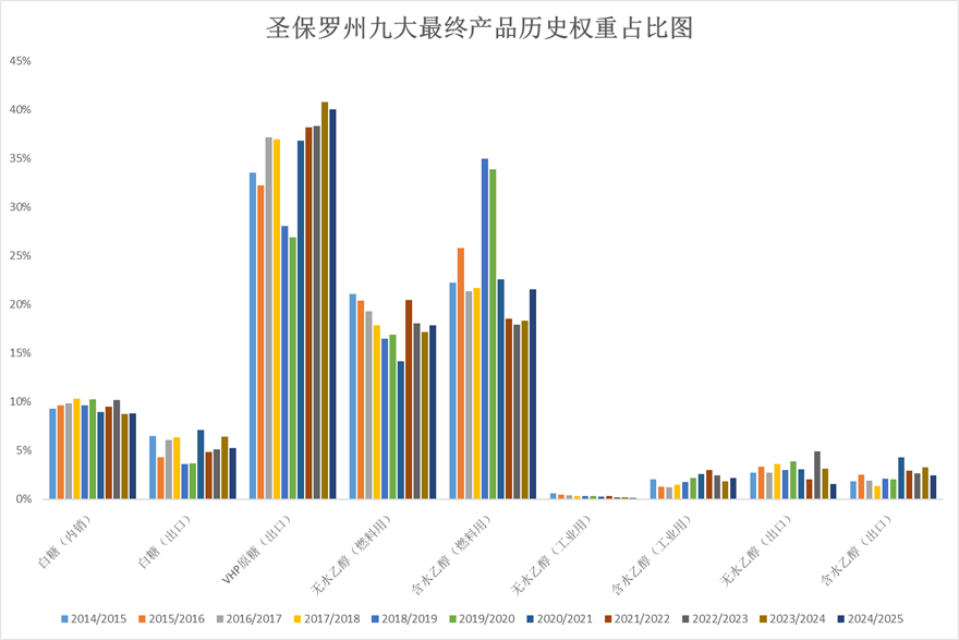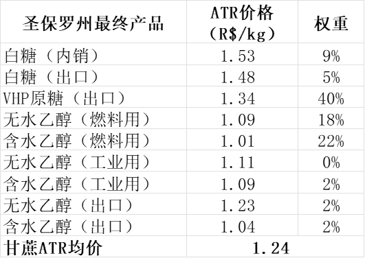 数据来源:Unica Cepea大地期货研究院 根据巴西圣保罗州样本,VHP出口原糖、燃料用无水乙醇和燃料用含水乙醇一直是权重前三大的最终产品,三大产品总权重可以占到75%-80%,其对ATR价格变化的影响作用最大。 (三)计算最终产品的ATR价格