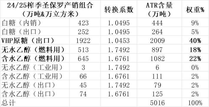 数据来源:Consecana大地期货研究院 9种最终产品根据其各自产销量赋权,由于糖和乙醇单位不同,因此需要通过转换系数将产品各自的产销量转换成统一的ATR含量,再根据其各自的ATR含量占比计算加权权重。