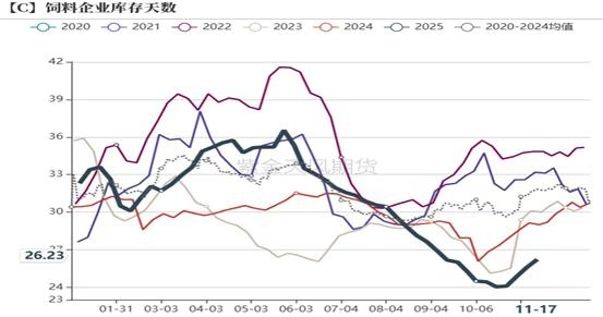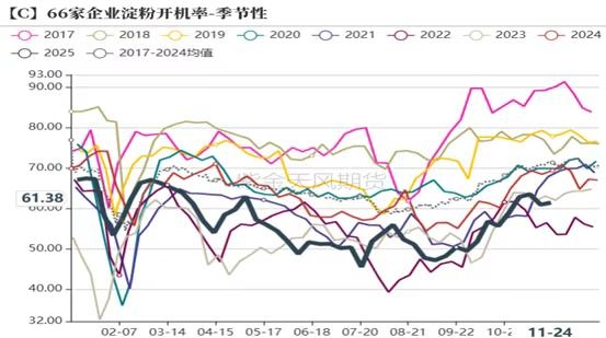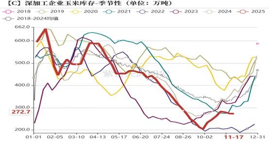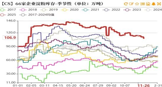 数据来源:上海钢联 紫金天风期货研究所 4、中下游囤货意愿不强 截止到11月24日,玉米深加工下游的主要两大产品淀粉和酒精的开机率分别为61%和71%,同比分别降低8个百分点和增加8个百分点。从利润来看,因近期饲料玉米价格不断上涨,酒精企业还是淀粉企业的采购成本增加,生产利润大幅下滑,因此淀粉开机率近期有所下滑,淀粉库存在近几年同期最高水平。因利润的下滑,目前深加工企业采购以及囤货意愿并不强,近期深加工企业玉米库存呈现逆势下滑趋势,从往年规律来看,在购销旺季,玉米库存呈现快速增加的趋势,而目前逆势下滑,可以现阶段看出深加工企业囤货意愿并不强。 5月以来农业农村部持续倡导集团企业以及规模化去产能,从制定目标来看,需要在现有基础上减少100万头母猪,降幅大约为2.5%。此外禽类方面,截至10月蛋鸡存栏量达到13.17亿只,近十年以来新高,白羽肉鸡在2025年存栏已经达到760.32万套,也处于2015年以来的历史高位,整体来看,今年猪禽产能基本都处于较为充裕或过剩状态,明年虽然呈现去产能趋势,但对应的饲料需求仍相对较为强劲,仅同比小幅下滑。因产能较为过剩,9月以来生猪以及蛋禽的养殖利润都进入亏损阶段,在现金流较为紧张以及去产能的预期下,养殖端对饲料备货以及囤货意愿较差。 图5:深加工企业开机率及库存