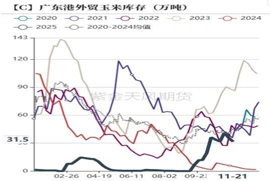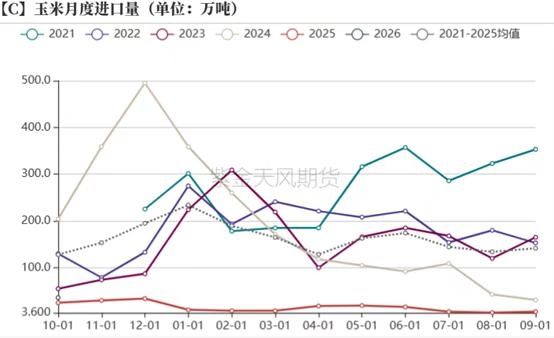 数据来源:上海钢联 紫金天风期货研究所 3、四季度进口量环比增加 玉米每年进口配额720万吨较为固定,通过近几年超配额进口以及拍卖计算,预估进口储备还剩下2000万吨左右。若按以此推算明年即使进口玉米维持低位,供应端仍不会出现较大的问题,而且今年拍卖的仅是2020-2022年的玉米,新进口超额部分的玉米还没有进入市场。若现货价格继续上涨,国家陈玉米拍卖或将增加,此外这些年限短的陈粮也可以进入饲料企业。调研期间,也拜访了一些饲料企业,部分企业是采购拍卖粮为主,是可以正常饲用的。 2025年10月玉米进口量36万吨,环比增500.00%,同比增43.10%。10月玉米进口量同比及环比均大幅增加,进口国主要是巴西,从近期广东港口外贸库存持续反弹也可以看出,四季度进口玉米到港量将较前两个季度大幅增加。进口巴西玉米一般在四季度以及明年一季度,从船期来看,11月-次年1月巴西玉米到港量预期在150-200万吨之间,但这个进口量还在进口配额内,暂不对国内玉米供需产生较大影响,但目前无论1%关税的巴西及阿根廷玉米,或者11%关税的美玉米进口利润都比较丰厚,若现货价格上涨超预期,或者不可控,不排除国内大幅增加国外进口。 图3:玉米月度进口量