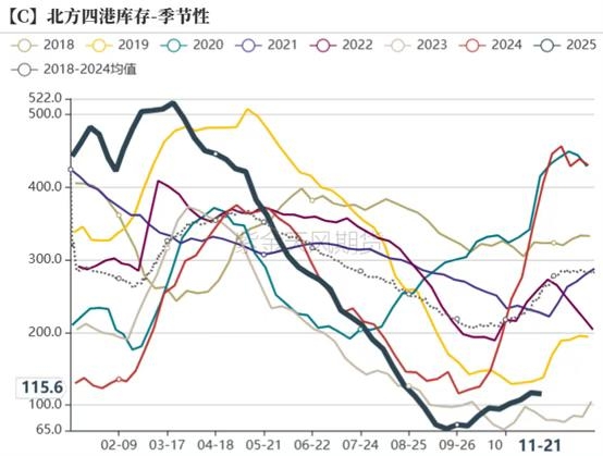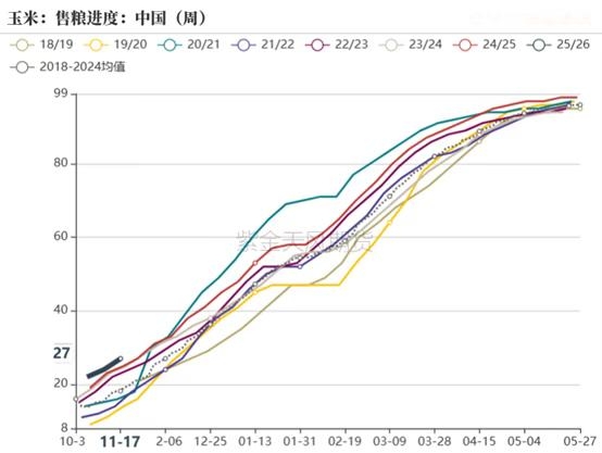 数据来源:国家统计局 紫金天风期货研究所 2、基层惜售情绪较强 11月上旬在东北玉米调研期间,正好赶上各地贸易商去基层收粮,本来要去拜访交流的贸易商仅仅通过电话联系,直观感觉是当时贸易商收粮情绪较强,这波收粮情绪的带动主要是华北、华中以及华东贸易商因当地优质粮源不能充分供应饲料企业,提前在东北购粮建库引发的,这波收粮情绪也打破了前期的购销僵持格局,伴随着玉米价格持续上涨,基层惜售情绪也随之增加,询价观望的比例增加,价格主动权回到基层手里。 因基层惜售情绪较强,现阶段东北玉米销售进度要慢于去年同期,但华北玉米因前期不宜晾晒,销售进度较快,因此整体来看国内前期销售进度的较快,11月之后销售进度整体慢于去年同期。 因三方数据相对滞后,仅从数据来看,今年的销售进度快于去年,但结合调研以及现阶段售粮节奏,现阶段玉米销售进度慢于往年同期。 此外在东北港口调研期间,无论陈粮还是新粮的港口库存都很低,港口货运较少,部分南方订单量延迟,这些粮源主要通过汽运走向华北、华中及华东,加上基层惜售情绪较强,市场流通粮源较少,现货供应较为紧张,但贸易商因对中长期市场并不看好,因此采购意愿并不强,部分贸易商在春节前等待回调后在入场。 图2:玉米售粮进度及北方库存
