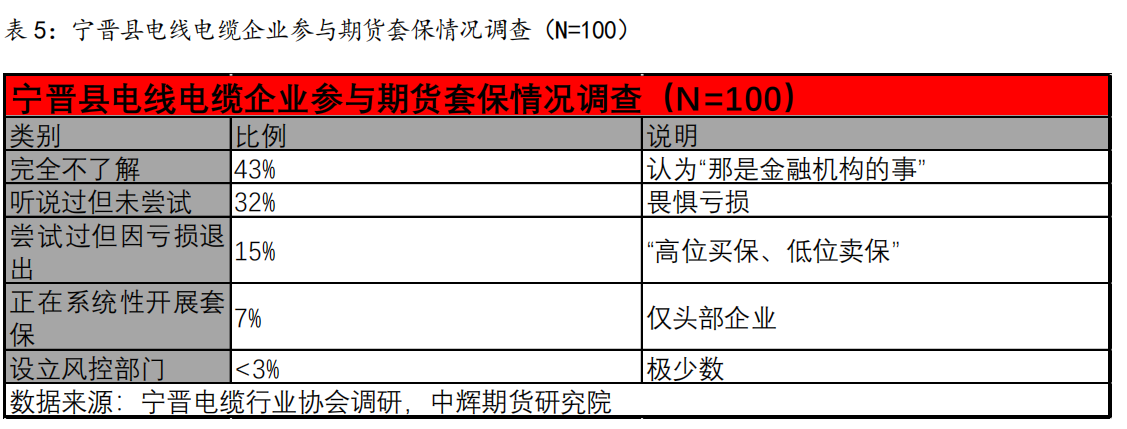 第三章:电线电缆企业套保难点 根据走访座谈,当地企业提到期货套保过程中最大的痛点和难点分别是资金,经验,人才。铜价逐年新高,波动剧烈,企业套保成本居高不下,当地缺少专业期货套保人才,企业套保经验不足,大多单打独斗,犹如游兵散勇。 资金方面,电线电缆的核心原材料为电解铜,约占产品总成本的60%–70%。以常见的 1×2.5mm² BV 线为例:每千米理论耗铜量约为 0.22 公斤,若铜价为 7 万元/吨,则铜材成本为 1.54 元/米,加工费、辅料、人工、税费等合计约 1.0–1.2 元/米,综合成本约 2.5–2.7 元/米。根据测算,当铜价上涨至 8.5 万–8.6 万元/吨时,仅铜材成本就升至 1.87 元/米,综合成本突破 3.0 元/米。根据市场权威机构估测,铜价每上涨 1 万元/吨,企业单位成本增加约 0.22 元/米,对于年产百万公里的企业而言,相当于每年多支出 2200 万元的成本增量。 而由于电线电缆企业以销定产,国网客户拥有绝对定价权,并且招投标往往集中在年底和年初,采取月度均价或者一口价,电线电缆企业的销售报价往往难以跟随铜价同步调整,导致利润空间被严重挤压。2020-2025 年,全球铜价走势波澜壮阔,企业经营面临巨大的价格风险和复杂的外部环境。铜价过山车行情中,不少经营管理经验不足,不善于应用期货衍生品的中小型企业逐渐被市场淘汰。 人才方面,宁晋电线电缆企业多为家族式民营企业,创始人多为上世纪90 年代下海创业的第一代企业家,如今普遍步入退休年龄,但其子女大多接受高等教育后选择留在大城市就业或者进入市县的体制内,不愿回到县城和村镇接手工厂。在“学而优则仕”,“士农工商”的传统儒家思想浸染下,北方民营企业二代接班问题尤甚于南方。据宁晋工商联抽样调查,约 65%的企业家表示子女无意接班,28%的企业正在寻找职业经理人过渡,仅 7%实现了顺利交接。这不仅带来管理断层风险,也制约了企业在战略规划、技术创新、资本运作等方面的长远布局。 此外,山河四省缺少985 高校,河北本地高校资源匮乏,缺少产融学基础。由于毗邻石家庄,宁晋县人才和资源外流严重,年轻技术人才倾向于前往保定、石家庄、天津乃至北京求职。金融、法律、IT 等复合型人才更是缺少对应岗位,即使开出高于本地水平 30%的薪资,仍难吸引外地人才长期定居。这一局面直接影响企业推进数字化转型、参与期货套保、开拓海外市场的能力。 经验方面,在本次走访调研中,笔者对当地电线电缆生产企业和贸易商进行了套期保值情况进行了初步的摸底,部分企业对期货套保表现抗拒和不信任,少部分应用期货套保的企业也缺乏专业套保团队,企业经营者就是一线操盘手,风控和仓位管理意识不足,容易陷入散户投机思维,追涨杀跌,常常低位卖保,高位买保,期货从规避对冲风险的工具变成了最大的风险来源,甚至因为期货套保变投机,导致巨大亏损,极大影响了企业经营者的心态和日常工作生活。