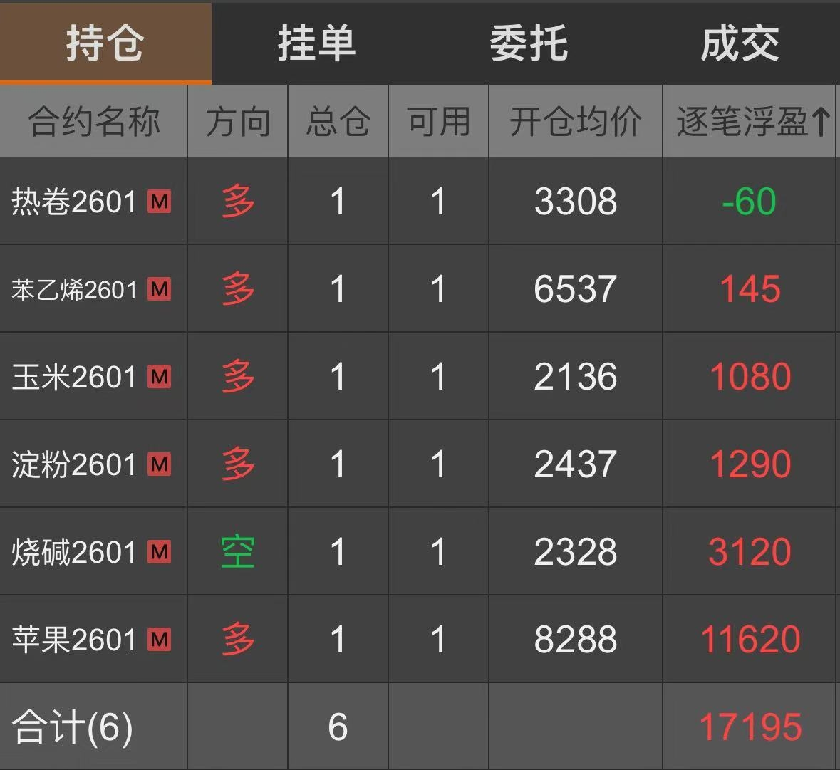 | 一、开仓总结 苹果:2025年9月22日,达到启动点的开仓条件,所以在14:54开多一手苹果2601合约,开仓价为8288。 淀粉:2025年10月31日,达到启动点的开仓条件,所以在14:49开多一手淀粉2601合约,开仓价为2437。 玉米:2025年11月4日,达到启动点的开仓条件,所以在14:51开多一手玉米2601合约,开仓价为2136。 烧碱:2025年11月14日,达到启动点的开仓条件,所以在14:51开空一手烧碱2601合约,开仓价为2328。 热卷:2025年11月25日,达到启动点的开仓条件,所以在14:56开多一手热卷2601合约,开仓价为3308。 苯乙烯:2025年11月26日,达到启动点的开仓条件,所以在14:57开多一手苯乙烯2601合约,开仓价为6537。 二、平仓计划 苹果:达到启动点的平仓止损/止盈条件,在收盘前或下一个交易日开盘后全部平仓。 淀粉:达到启动点的平仓止损/止盈条件,在收盘前或下一个交易日开盘后全部平仓。 玉米:达到启动点的平仓止损/止盈条件,在收盘前或下一个交易日开盘后全部平仓。 烧碱:达到启动点的平仓止损/止盈条件,在收盘前或下一个交易日开盘后全部平仓。 热卷:达到启动点的平仓止损/止盈条件,在收盘前或下一个交易日开盘后全部平仓。 苯乙烯:达到启动点的平仓止损/止盈条件,在收盘前或下一个交易日开盘后全部平仓。 注:本交易总结由第三方提供,只作为投资理念和方法的交流,不作为七禾网的观点,也不作为投资参考和建议。 附: 1、交易者简介 十年股票/期货/外盘交易经验,每年都实现投资盈利。 擅长微观盘面分析和宏观市场分析,总结了数套有效的盈利模式,和众多高手有深入交流,收益良好。 2、持仓截图