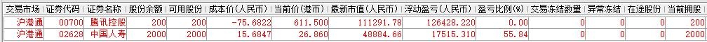 | 账户初始资金:100000.00元 2015年5月18日入金:32000.00元 2015年5月29日入金:9000.00元 2015年6月23日入金:20000.00元 2015年6月26日入金:10000.00元 2015年6月29日入金:20000.00元 2015年7月3日入金:20000.00元 2015年7月8日入金:10000.00元 2016年1月12日入金:90000.00元 2016年1月22日入金:100000.00元 2016年1月27日入金:100000.00元 2016年3月21日出金:270000.00元 2016年4月12日出金:35639.23元 2016年0月10日出金:56913.08元 2016年10月28日入金:60000.00元 2017年3月7日出金:113800.00元 参考市值:177183.44元 账户资产:177589.69元 截至今日账户A股盈亏:138876.11元 截至今日账户港股盈亏:-45612.36元 账户净值:1.988 资金股份