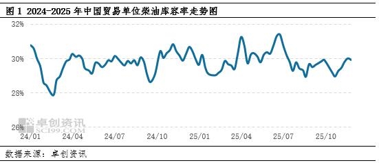 | 【导语】11月下旬,国际原油价格整体呈现出震荡下行走势,市场观望情绪浓厚,业者进购意愿低迷。叠加国内柴油需求整体表现欠佳,抵消了来自供应端趋紧的影响,因此贸易单位下旬多消化库存为主,大单进购操作减少,柴油库容率月末有所降低。 据卓创资讯对沿海以及内江周边30家社会贸易单位调研发现,截至2025年11月27日,国内成品油贸易单位柴油库存占库容的比重在29.93%,较中旬降低0.16个百分点,同比增加0.04个百分点。