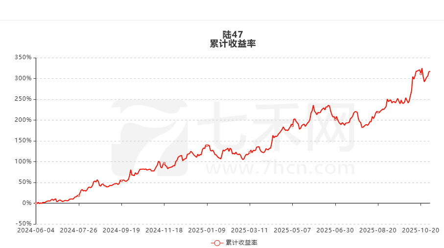 七禾网实战排行榜账户“陆47”,展示时间从2024年6月4日至今,累计收益率317.5%,累计净利润2004.53万,最大回撤15.912%。