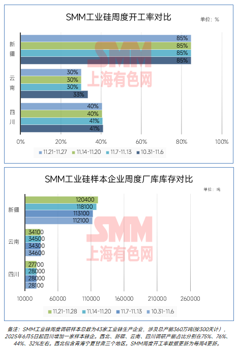 | 报告品种:工业硅 原文链接:https://mp.weixin.qq.com/s/MaJwHcy_lNMtbAMAlaTfKg 根据市场反馈了解,11月21日至11月27日: 新疆地区样本硅厂周度产量在41090吨,周度开工率在85%,较上周环比维持稳定。近一周新疆样本硅企开工率保持稳定,出货方面,部分硅企看期货盘面位置逢高出货,下游订单偏清淡出货不多。新疆个别硅炉有增开情况,下周开工率微幅增加。 云南样本硅企周度产量在3510吨,周度开工率30%,较上周维持稳定。样本选取原因云南样本硅企周度开工率高于地区总开工率。即将进入12月硅企生产成本进一步抬高,部分硅炉已经或计划在近日减停,下周云南样本硅企开工率将表现下行。剩余在产硅企为配备小水电有成本优势或有下游订单交付需求的企业。 四川样本硅企周度产量为4690吨,周度开工率在40%。样本开工率较上周维持稳定。抛去样本内大厂,剩余硅企开工率在12%附近。四川由平水期转向枯水期,部分硅炉计划在11月末减产,12月四川开工率也进一步下降。