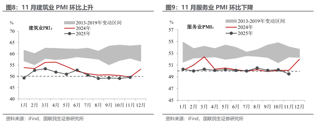 11月出口端提供了最大的“彩蛋”。11月PMI新出口订单指数一举上升1.7pct,其改善力度明显优于季节性,背后主要有“两股力量”的推动。一是在中美达成阶段性贸易协议的背景下,预计对美出口增速将有所修复;二是海外圣诞“订单季”逐步到来、为出口提供一定支撑力。 新型政策性金融工具为建筑业“加持”,而服务业更需“加一把火”。11月建筑业PMI告别6月以来的整体下行区间,环比上升0.5pct至49.6%,这也是6月以来建筑业PMI的最大增幅。不仅反映了新增专项债逐步投向实物工作量后的政策见效,更是反映了新型政策性金融工具的落地效果。相较之下,环比下降0.7pct、达到历史同期较低位置的服务业PMI略显逊色,后续亟需以更大力度推动服务消费机制的完善。