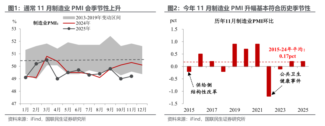 | 11月制造业PMI如期呈现“节后回暖”态势,背后却有一些不寻常的信号耐人寻味。随着工作日天数相较于10月“长假月”边际增多,11月制造业PMI通常会呈现出环比上升。2015-2024年间,11月PMI平均环比上升0.17pct,今年0.2pct的增幅基本符合这一季节性特征。然而,看似平稳的数据背后实则“暗藏玄机”,一些细项结构却传递出不同于往常的信号,值得深入解读,具体来看: