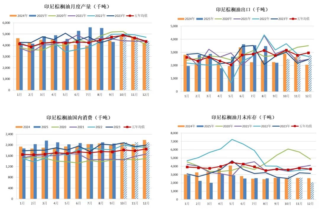 资料来源:VDMA, International Technology Roadmap for Photovoltaics 在交易层面,市场普遍存在集体拥抱共识的惯性思维,这似乎能给予抱团者某种“安全感”,但一个关键问题是:价格已经到高位,是否应该在此时介入泡沫。这是个有争论的话题:“When I See a Bubble Forming, I Rush in to Buy,adding fuel to the fire。That is not irrational.”——George Soros. 为此,多数交易者认为,当看到泡沫那一刻,应当积极买入,因为泡沫的发展通常超出市场预期,类似地我们通常不建议做工业利润的空头。 但我们仍然有一种警惕,即如果没有看到需求的跟进,商品多头叙事能否顺利演绎?毕竟这不是一个由需求驱动的传统意义上的商品牛市,除有色板块外,其他板块并不能够即刻共享多头叙事,因此我们看到了原油价格的持续回落以及国内定价的黑色系商品保持弱势震荡,后者暗示需求侧尚未看到显著改善,这最后会演绎成泡沫扩大的牢笼: 国内经济数据方面: 1、11月国内制造业PMI录得49.2,前值49,仍较预期疲软;非制造业PMI录得49.5,前值50.1,暗示复苏的弱态势仍在延续。 2、10月规模以上工业企业利润呈现总体微增但单月下滑的态势,1—10月份全国规上工业企业利润总额59502.9亿元,同比增长1.9%,但10月单月利润同比下降5.5%,较上月21.6%的增幅明显回落,这存在高基数的原因。行业分化突出:高技术制造业如计算机通信设备和电气机械增领跑,但传统能源如煤炭开采,轻工行业如纺织服装等行业降幅显著。总体看,经济复苏不均衡,新动能驱动增强,但外部需求和转型压力仍制约部分行业。 因此,在需求偏弱的窗口期,我们仍然会锚向此前提出的一个研究框架,即供应定价能力空前强大。近期供给侧有明显变化的品种是玻璃,最近有看到玻璃生产在逐级停产,在产生产线283条,日熔量从此前16万吨降至15.6万吨,短期看,停产落地有望强化价格触底预期,但需观察库存去化持续性。 另一方面,市场仍然能够在政策端需求寻到一些亮点,例如储能规划可能会逐步落地。伴随新一轮的资本投入,市场逐渐建立起储能项目获利的信心:一是政策补贴;二是谷电和峰电之间价差会逐步走高,进而未来装机量有望超预期。另一方面,电池龙头12月电池及材料排产整体环比微增,同比增幅高达30%-50%,行业维持高景气判断,但近端复产的利空仍值得注意,价格预计维持高波动。 泡沫之外的可能性 站在年底节点上,我们理解未来商品多头叙事不太容易被彻底击溃,尤其是在经历2025年4月和6月的两轮低谷之后。在拥抱多头过程中,一方面我们继续警惕原油基于当前高库存、需求走弱以及不断弱化的地缘冲突带来的供给风险,不太会形成系统性反弹。另一方面继续寻找供给侧出现边际变化的品种,除了玻璃外,关注农产品板块中的棕榈油,原糖及谷物市场。棕榈油方面,印尼9月棕榈油环比减产22.32%,大幅减产发生在东南亚季节性产出高峰时段,这相当意义上巩固了棕榈油价格的底部周期,利多驱动可能既来自近期东南亚洪水灾害,也来自GAPKI在6-8月对产量高估的修正。我们理解短期随着产出不确定性的收敛,棕榈油可能更倾向于朝着多头方向定价。(原糖及谷物请关注后续的报告)