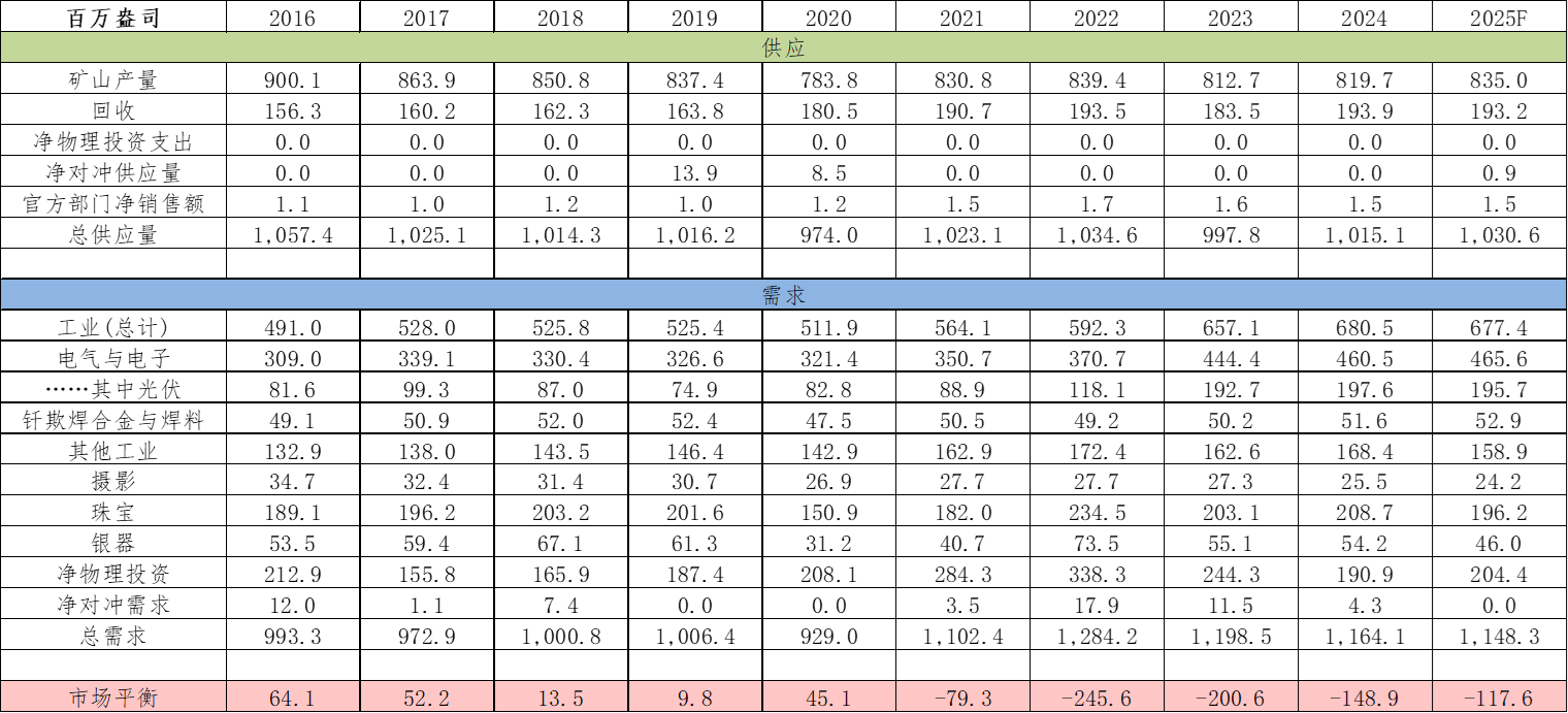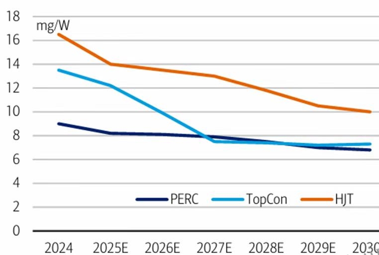资料来源:silver institute,中信建投期货整理 根据彭博的数据在全球白银的消费中,涉及太阳能面板生产的需求或在2025年达峰,触及7000吨(占比18%),未来基于技术改良或降低到5000吨左右。银在太阳能装机中的需求正随技术更替呈现逐级下降趋势,核心在于光伏电池技术迭代推动银浆单耗持续压缩与需求潜力分化。传统PERC技术(发射极钝化与背面接触)曾为主流,因效率瓶颈被N型技术取代,其银浆需求随市占率萎缩(从2020年100%下降到最近10%以内)自然下降。当前N型主流TopCon,2025年市占率将超80%,成为产能扩张核心,但其银浆需求占比虽最高(约70%),却通过亚微米银粉等技术使单耗从2023年大幅下降25%至2024年8.7mg/片(十年前PERC的银用量曾高达每瓦30毫克),且持续优化,需求强度逐级减弱。第三代HJT(异质结)虽有低温工艺、高双面率(>90%)优势,但当前单耗高达14-25mg/W,2025年市占率仅6.4%。长期银依赖度将显著降低。 白银在不同太阳能技术中的使用量
