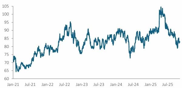 | 近期商品市场经历了一轮有色及贵金属的显著上抬,驱动源自美联储对12月是否降息预期的变化,降息概率从此前约30%-40%向上跃迁至80%。其中白银涨幅最为突出,Comex白银突破新高,最高触及58.6美元/盎司,年度累计涨幅超过90%。 图:金银比价跌破80