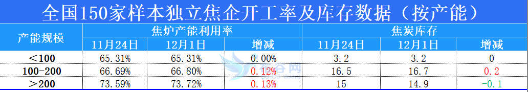 独立焦企开工率及库存详述 1、按产能统计 各产能企业开工率上升为主