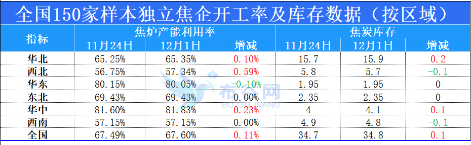 按区域划分,各产区开工率涨跌互现。其中 华北本期65.35%,环比上升0.10%; 西北本期57.34%,环比上升0.59%; 华东本期80.05%,环比下降0.10%; 东北本期69.43%,环比持平; 华中本期81.83%,环比上升0.23%; 西南本期57.15%,环比持平。 库存方面,各区域焦炭库存涨跌互现。 华北本期15.9万吨,较上期增加0.2万吨; 西北本期5.7万吨,较上期减少0.1万吨; 华东本期1.95万吨,较上期持平; 东北本期2.35万吨,较上期持平; 华中本期4.1万吨,较上期增加0.1万吨; 西南本期4.8万吨,较上期减少0.1万吨。 3、总述 供应方面,近期原料煤价格下跌,焦企利润有所修复,焦企开工率回升,焦炭供应稳中有增。需求方面,下游钢厂多数仍亏损,铁水产量回落,刚需小幅下降,下游目前多以刚需采购为主,焦企厂内库存略有上升。今日焦炭首轮提降落地,预期焦炭市场短期偏弱运行。 七禾带你去调研,最新调研活动请扫码咨询