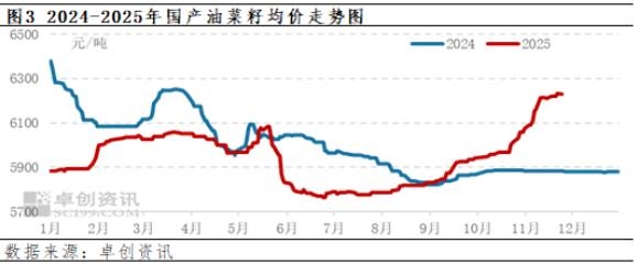 随着进口油菜籽供应量下降,下游市场对国产油菜籽需求量开始增加。10月份中秋国庆假期之后,下游油坊开始集中补库,贸易商走货速度明显加快,同时国内国产油菜籽剩余量不断减少,贸易商上货困难,支撑国产油菜籽价格连续上涨。据卓创资讯统计,11月份国内南方地区国产油菜籽均价在6172元/吨,较10月份相比上涨195元/吨,涨幅为3.26%。