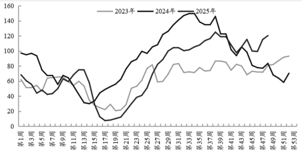 图为全国主要油厂豆粕库存(单位:万吨) 国内油厂开机率维持高位 目前国内油厂开机率处于高位,周度大豆压榨量维持在230万吨左右的较高水平。在较高到港量和开机率的双重作用下,豆粕供应充裕,库存呈现显著攀升态势。相关数据显示,截至11月21日,国内主要区域豆粕库存已达115.15万吨,较去年同期大幅增加38.11万吨,增幅高达49.47%;而未执行合同量为459.51万吨,同比增加4.48%,尽管远期需求有一定支撑,但不足以消化当前迅猛增长的现货供应。 豆粕需求呈现刚性基础稳固,但短期增量有限的复杂格局。生猪及禽类存栏量持续处于历史高位,为豆粕消费提供了稳定的需求支撑,较高的提货量表明下游实际需求仍具备韧性。然而,受生猪及家禽养殖行业亏损影响,下游饲料企业采购情绪趋于谨慎,多数企业仅维持安全库存水平。这种谨慎心态导致豆粕表观消费量环比增速明显低于产量增长,整体需求呈现增量乏力的特征。另外,随着冬季猪肉消费旺季来临,生猪出栏节奏加快,限制豆粕饲用消费增长空间。水产养殖进入传统淡季,水产饲料对豆粕的需求也显著收缩。不过,远月基差合同成交回暖,显示部分下游企业开始布局远期需求,这为后期豆粕消费提供了一定支撑。