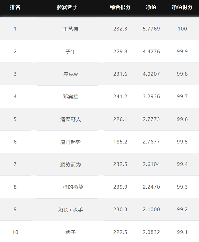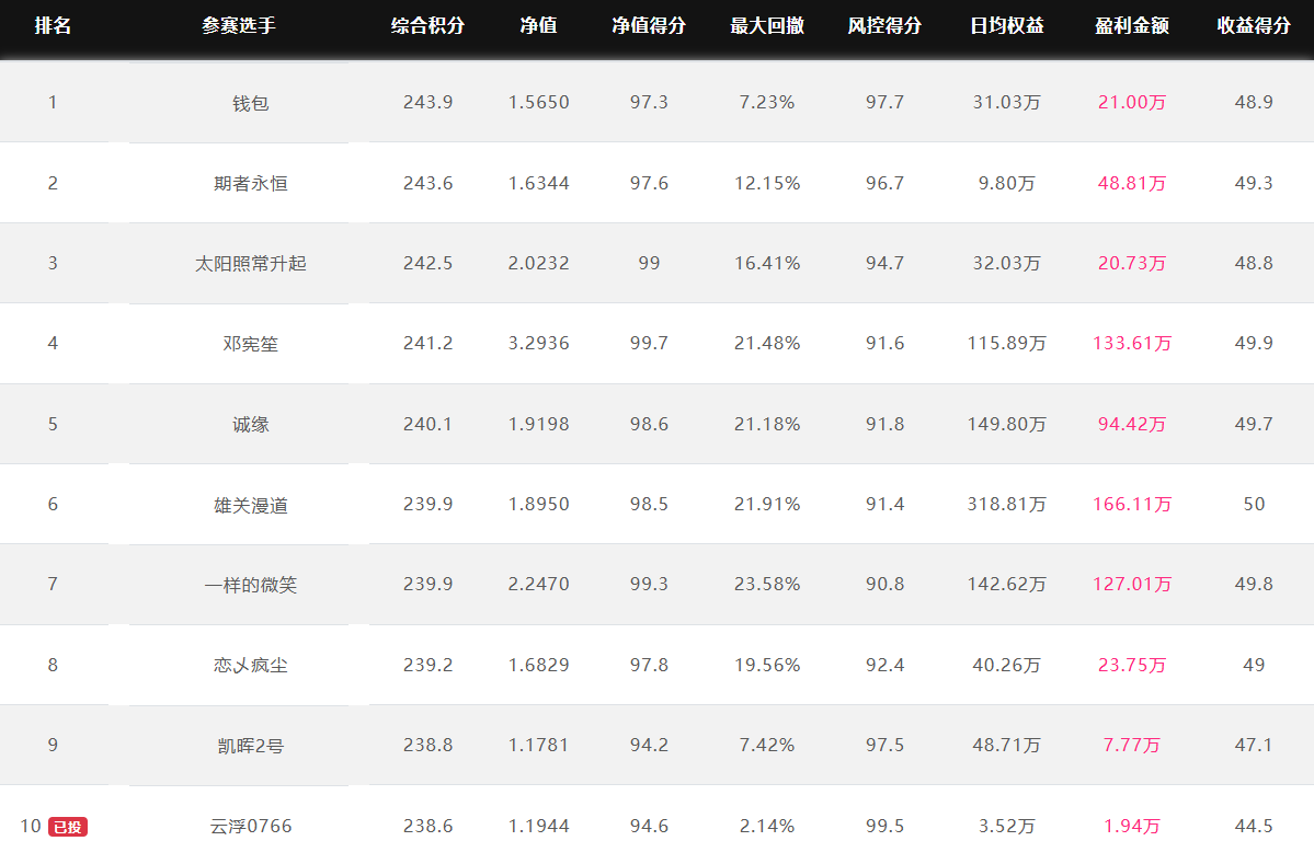 奖金上不封顶 特定期货公司参赛奖金翻倍 优秀选投 每周选优秀选手对接资金 达标必投 单笔最多给1个亿管理型资金 管理型资金盈利分成20%~70% 免费培训/研报/调研/咨询 诚邀您参赛! 为了促进国内期货市场交易人才的发展和成熟,七禾网举办本次“期货CTA英雄联盟”实盘大赛&超级服务,招募优秀的操盘手,为优秀的交易人才搭建桥梁! 第四届大赛圆满结束,第五届荣耀开启,欢迎参赛!第五届大赛已于2025年7月1日开赛,火热报名中,比赛过程中持续接受报名,大赛奖金&管理型资金&超级服务,等你来领! 2023年2月16日后,在主办方指定的几家期货公司中的某一家C公司新开户参赛,享奖金翻倍! 在主办方指定的几家期货公司中的某一家B公司新开户参赛,享奖金翻倍! 大赛中的优秀选手,只要在大赛中有3个月及以上的实盘业绩,主办方将每周发送优秀参赛者的业绩、资料给合作的数十家资方,供其考察是否投管理型资金。至2022年8月12日,资方已选出23名优秀投顾,累计投入超5.5亿元管理型资金。 优秀选投:通过主办方及资方考核后,将获得管理型资金(资金来源:七禾网自有资金(买优秀选手的基金产品)、七禾网股东、数十家合作资方) 在主办方指定的几家期货公司中的某一家B公司新开户参赛,以及2023年2月16日后,在主办方指定的几家期货公司中的某一家C公司新开户参赛,可以按照:“达标必投”进行考核(将给予单笔100万元~1亿元的管理型资金,分红比例20%~70%),详细规则请联系微信:15858201632 大赛综合排名前10名 2025.12.2