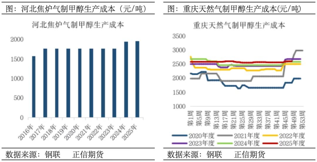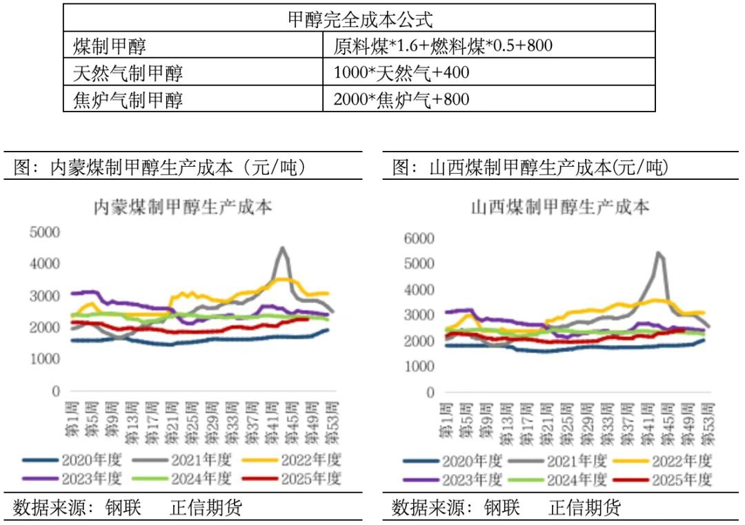 三、天然气制甲醇成本结构分析 天然气制甲醇是一种较为清洁环保的合成工艺路线,产出甲醇质量较高。但由于我国少气资源结构的特点,政策对天然气的影响程度较大,部分地区在冬季用气高峰期时会有限气政策。 天然气制甲醇产能占比约为9.6%,主要分布于西北和西南地区,西南地区天然气价格多受政策影响,一是因为我国天然气储量本身有限,二是因为在地区政策支持招商引资中,部分地区工业用天然气能降低价格。天然气制甲醇装置多配套下游产品,因天然气作为衍生产品丰富的清洁能源,其经济优势较强。假设西北天然气气价1.88元/立方米,西南天然气气价2.28元/立方米,且以天然气制甲醇单耗1000立方米,固定成本400元/吨计算,西北甲醇生产完全成本大约为2280元/吨,西南生产完全成本大约为2680元/吨。 四、总结 综上所述,甲醇生产成本主要由原材料、能源和固定成本三部分构成:煤制甲醇企业如新奥化工、昊华能源依托煤炭自给优势,其原材料(煤炭)是成本核心,占比普遍超过55%。焦炉气制甲醇则通过副产气综合利用实现低成本运行,代表企业金牛化工、宝泰隆新材料展现出良好的循环经济效益。在天然气制甲醇中原料占比较高,但受制于国内气源影响,区域成本差异显著,经济性受限。市场上核算甲醇成本公式一般由原料及加工费用组成,具体如下所示,仅供参考。