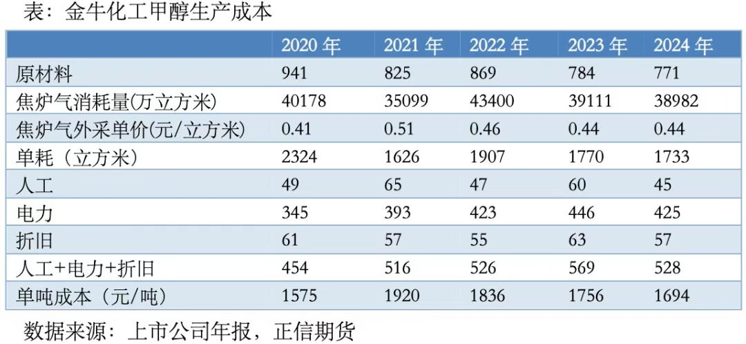 二、焦炉气制甲醇的成本结构——以金牛化工与宝泰隆新材料为例 焦炉气是炼焦过程中产生的副产品,由多种烟煤在焦炉中经高温干馏生产焦炭和焦油时同步生成,是一种富含氢气、甲烷和一氧化碳的可燃性混合气体。目前,我国焦炉气制甲醇产能约占全国甲醇总产能的13.7%,装置多由焦化企业配套建设,单套规模普遍较小,通常介于10万至40万吨/年之间。 金牛化工是该路线的典型代表,拥有20万吨/年的焦炉气制甲醇产能,采用“副产气综合利用”模式。在成本结构中,原材料成本占45%,是最大的成本项,主要由作为炼焦过程副产品的焦炉气构成,尽管焦炉气的单位成本较低,但耗用量大,总量占比依然较高。电力成本以25%的比例成为第二大支出,由于甲醇合成过程中需要运行大量设备如压缩机、泵和冷却系统,导致高能耗。人工与折旧合计仅占约6%。