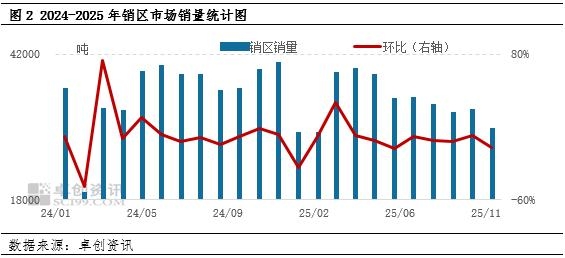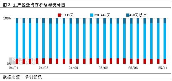 需求未及预期,销区销量延续低位 11月上旬受到“双十一”电商和商超促销活动等提振,需求略有好转,供需关系有所收紧,中下旬市场虽缺乏节日利多支撑,但是低温天气利多鸡蛋存储,且蛋价处于相对低位情况下,各环节采用轮库模式,一定程度缓解销售压力,供需关系维持相对平稳,市场无明显节日需求支撑,终端需求始终处于不温不火的状态,叠加业者对后市行情信心不足,故而贸易商多维持低价补货-高价出货-按需采购的循环参市模式,整体需求量有限,销区日均销量环比减少。销区销量受产区发货和销区需求的共同影响,一定程度上反映出产区流出量。长线产能压力虽缓慢减少,短期内产能相对稳定;销区销量即产区流出量呈先减后增趋势,对产区库存的利空作用由强转弱。
