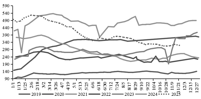 | 近期,PX需求预期向好,对PTA成本支撑增强,库存持续去化。短期市场焦点将集中在PTA供应收缩与出口订单修复上。 PTA期货价格受成本影响较大。上周,OPEC+宣布明年一季度暂停增产,今年四季度至明年一季度原油供应过剩预期较强,加之需求季节性偏弱,油价延续偏弱运行。PX方面,截至11月底,国内PX装置开工率为88.3%,环比下降1.2个百分点;亚洲PX装置开工率为78.7%,环比下降1个百分点。11月以来亚洲多套装置集中检修,PX开工率可能进一步下降。韩国部分装置计划12月中旬停车,导致PX现货市场供应偏紧,PTA新装置投产将进一步增加PX消耗。PX本周效益继续走强,PXN绝对价格涨至281美元/吨,处于年内高位。展望2026年,前三季度PX无新增产能,供需预计保持偏紧格局,明年二季度检修高峰期可能出现明显的供需缺口,给PTA带来较强的成本支撑。