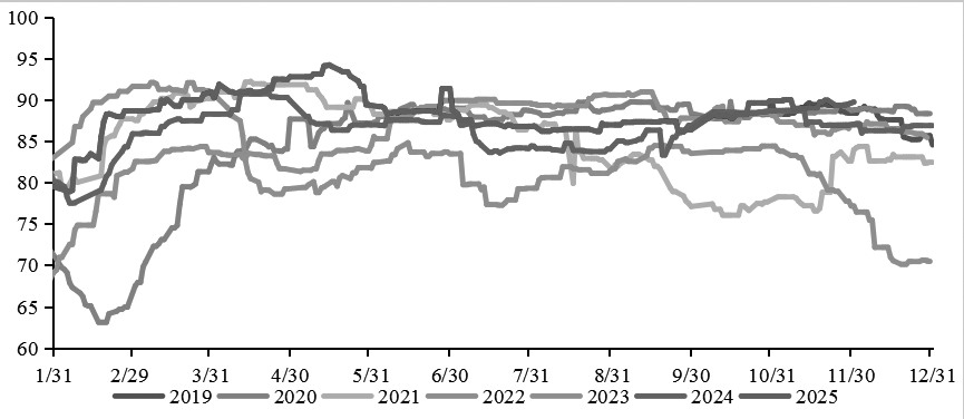 图为国内PTA周度库存(单位:万吨) 供应方面,2026年国内PTA产能预计保持稳定,无新增产能投放。11月后PTA开工率由78%降至73.81%,检修导致供应减少近200万吨,周度社会库存减少8.8万吨。从库存结构来看,聚酯工厂原料库存可用天数维持在6~8天,库存结构相对合理。PTA整体库存水平远低于近两年同期水平,且供应可能进一步下降,整体库存压力不大。
