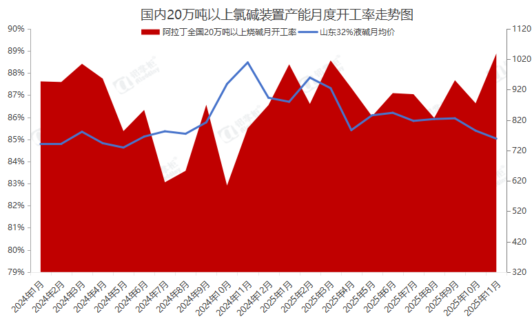 | 报告品种:烧碱 原文链接:https://mp.weixin.qq.com/s/kPHg6qrSkLHK-_z8YZ1zzA 阿拉丁(ALD)调研数据显示,在11月期间,国内氯碱行业中产能达到20万吨及以上的工厂,其烧碱总产能规模为4483万吨,当月实际投入运行的产能是3984.7万吨,开工率达到88.88%,环比提升2.25%,与去年同期相比则提升3.95%。