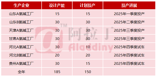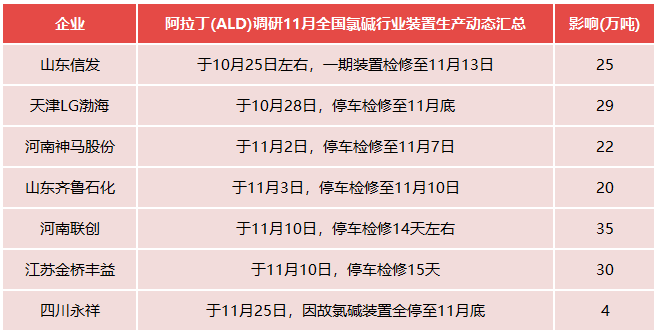 数据来源:阿拉丁(ALD) 11月国内烧碱运行产能之所以增加,主要归因于当月产能负荷开工较为充足。具体来看,10月份进行检修的23家氯碱工厂中,有20家已顺利完成检修,这些工厂包括山东华祥、内蒙古亿利、新疆天业、沈阳化工、内蒙古君正、河南永银、山东鲁泰、宁夏金昱元、山东金岭、浙江巨化、新疆中泰、杭州电化、山西瑞恒、沧州聚隆、航锦锦西、浙江嘉化、河南神马股份、河南开元、江苏理文、山东鲁西等。不过,其中浙江地区氯碱工厂虽结束检修,但生产负荷并未完全开满,一直维持在60-80%的水平。 进入11月,国内处于检修状态的氯碱工厂数量大幅减少,仅有7家仍在检修。同时,有5家氯碱工厂生产负荷有所下降,分别是山东海化、山东恒通,以及浙江巨化、杭州电化、浙江嘉化。